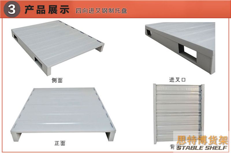 鋼制托盤(鋼托盤)適合叉車作業(yè),存取貨物方便。主要用于多用途的地面存儲、貨架存儲及貨物聯(lián)運、周轉(zhuǎn)等超輕金屬托盤系列。集裝、堆放、搬運和運輸?shù)姆胖米鳛閱卧?fù)荷的水平平臺裝置。鋼制托盤是現(xiàn)在工業(yè)重要的倉儲與運輸輔助設(shè)備之一。鋼制托盤主要材料為鋼材或鍍鋅鋼板,經(jīng)專用設(shè)備成型,各種型材互相支撐,鉚釘連接加強