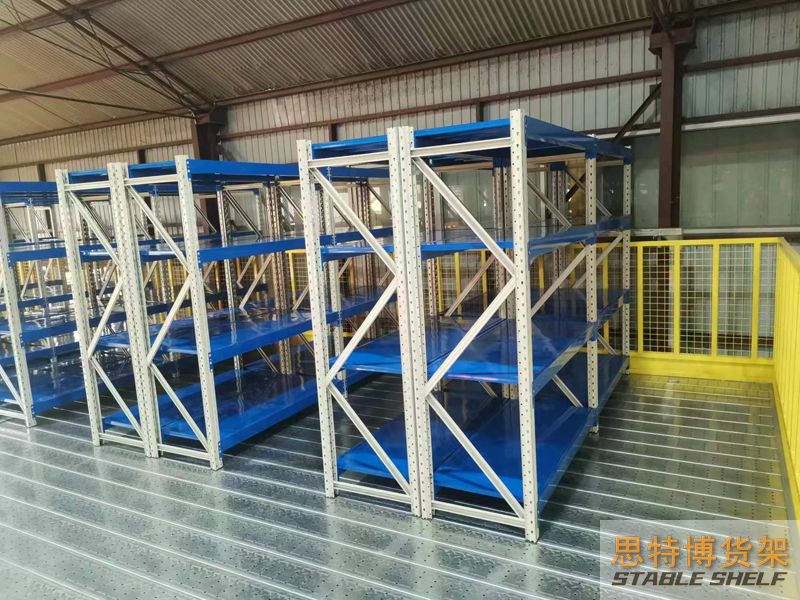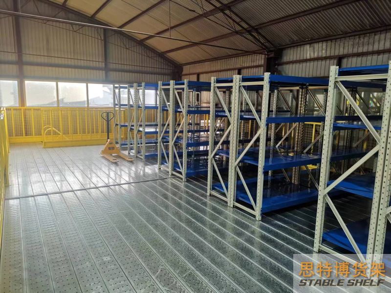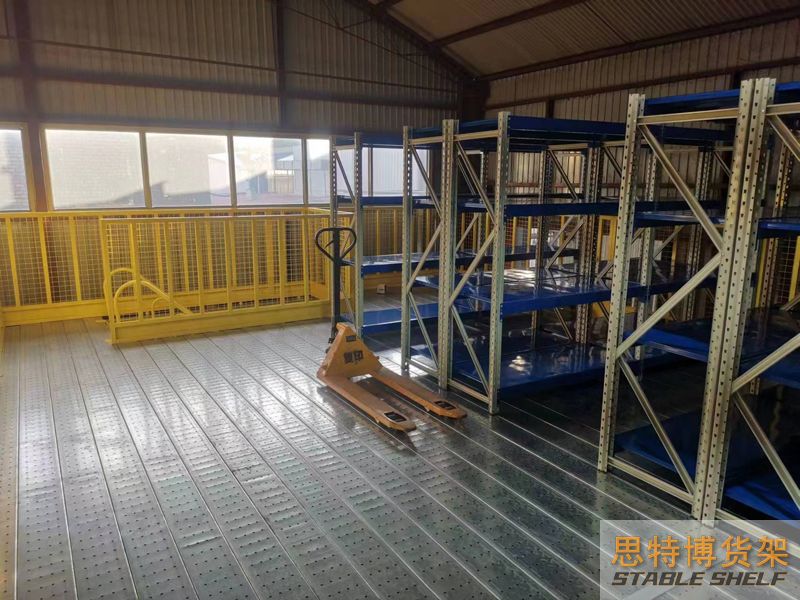 閣樓貨架系統(tǒng),通常利用中型擱板式貨架或重型擱板式貨架作為主體支撐加上樓面板(根據(jù)貨架單元的總負(fù)載重量來決定使用何種貨架),樓面板通常使用冷軋型鋼樓板、花紋鋼樓板或鋼格柵樓板。