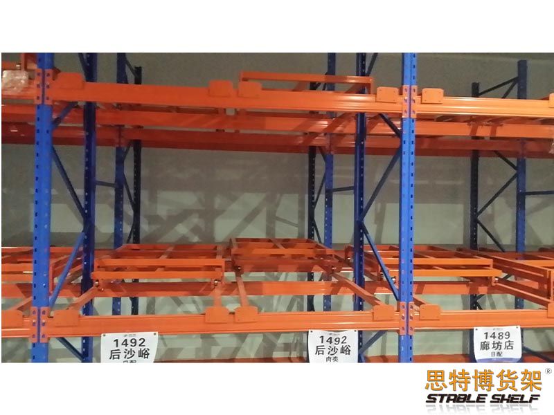 壓入式貨架又名后推式貨架——是在前后梁間以多層臺車重疊相接,從外側(cè)將疊棧貨物置于臺車推入,后儲存之貨品會將原先貨品推往里面。壓入式貨架是由托盤小車等典型結(jié)構(gòu)件組成,托盤車具有可流動特性,貨物被規(guī)定于貨架的一端進出,并遵循先進后出順序。儲運貨物時叉車只位于貨架通道水平較低的一端作業(yè),無需進入貨架貨物存儲通道。此類貨架具有存儲密度高,儲運速度快的典型特征。通常用于存儲場地極其有限,但需要增加存儲容量或?qū)ω浳镉袝r間要求等對貨物揀選要求不高的場合使用。壓入式的優(yōu)點就是節(jié)約作業(yè)通道數(shù)量,對叉車要求不高,可以有效提高利用率,主要應(yīng)用在倉庫空間不足,而且倉庫的面積又不大的地方;而且貨品要符合可以先進后出的位置。