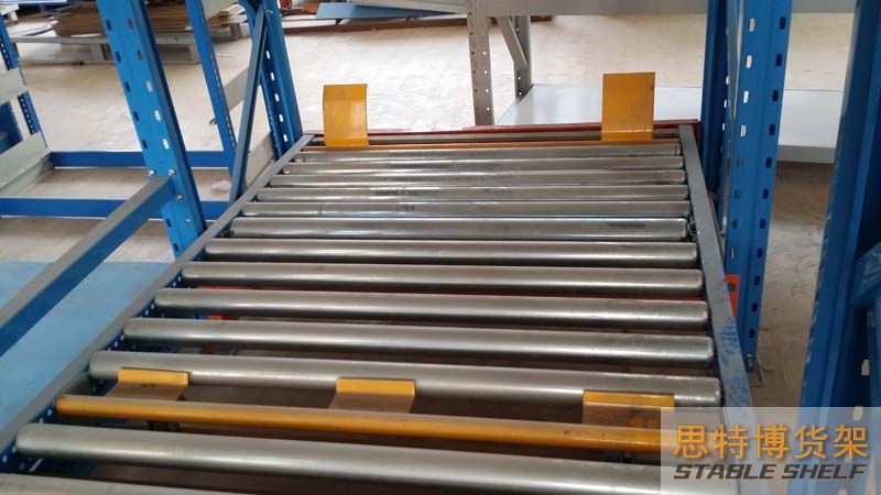 重力式貨架又叫輥道式貨架,屬于倉(cāng)儲(chǔ)貨架中的托盤(pán)類存儲(chǔ)貨架。重力式貨架是橫梁式貨架衍生品之一,貨架結(jié)構(gòu)與橫梁式貨架相似,只是在橫梁上安上滾筒式軌道,軌道呈3-5°傾斜。托盤(pán)貨物用叉車(chē)搬運(yùn)至貨架進(jìn)貨口,利用自重,托盤(pán)從進(jìn)口自動(dòng)滑行至另一端的取貨口。重力式貨架屬于先進(jìn)先出的存儲(chǔ)方式。